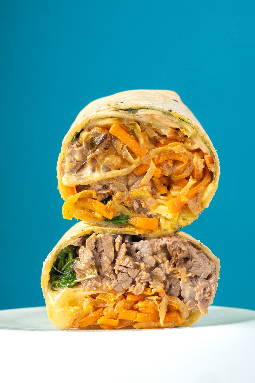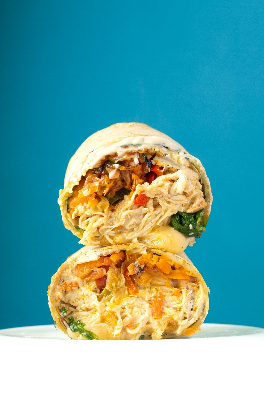 en pan de cúrcuma con rúcula, tomates y cebolla caramelizada