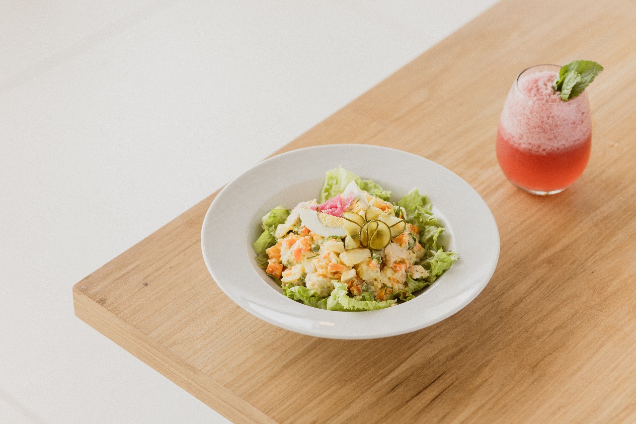Ensalada rusa, pepinos encurtidos, huevo duro, cebolla morada, mayonesa de hierbas, pollo o atún y lechuga