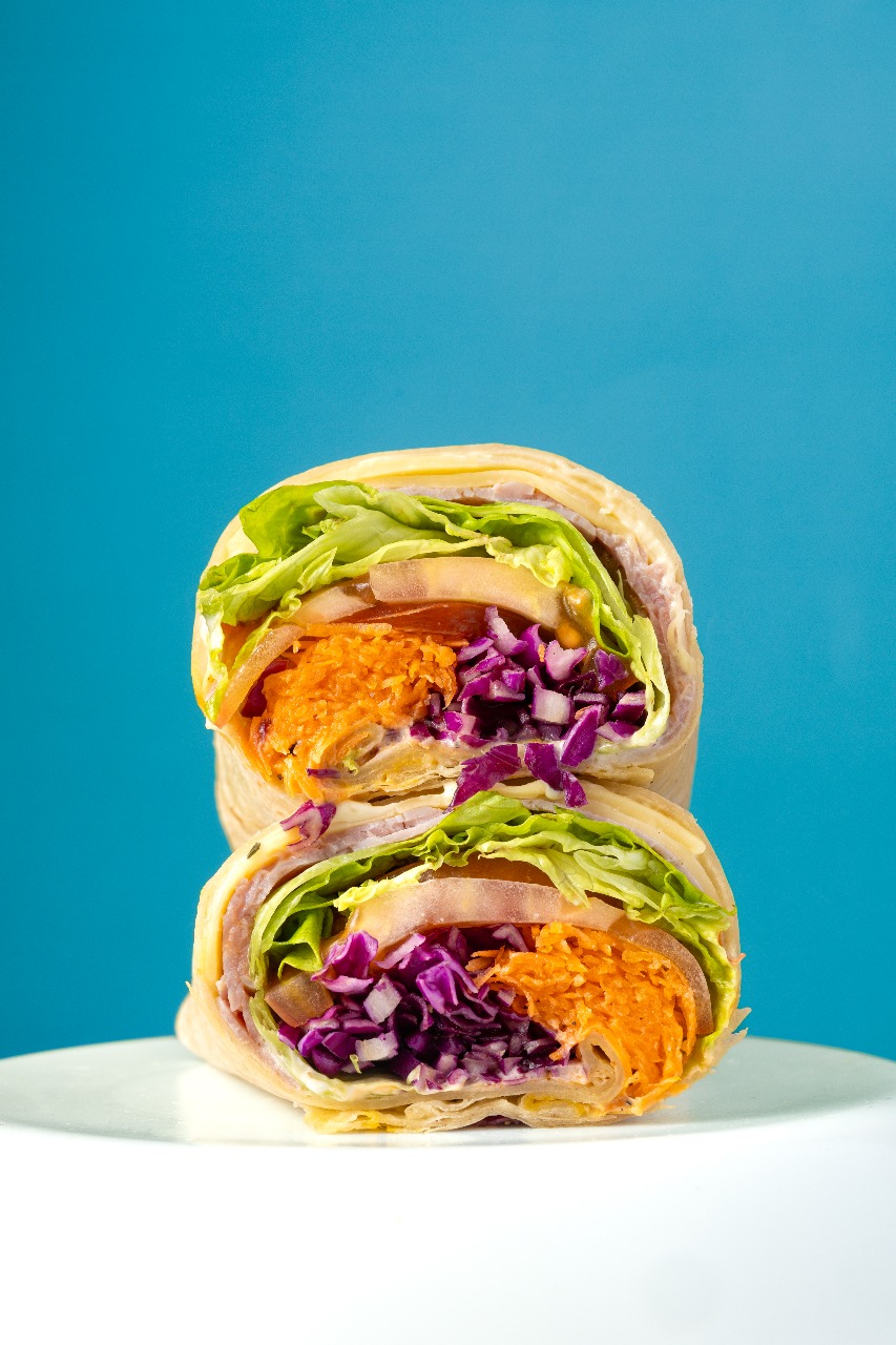 Jamón, queso, lechuga, tomate, zanahoria, repollo, mayonesa de hierbas